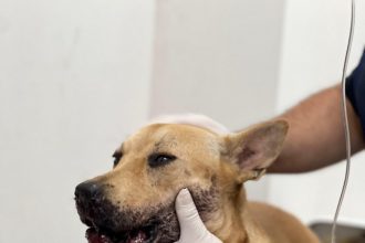 Cadela sem raça definida foi atingida por bomba do tipo catolé durante as comemorações de…