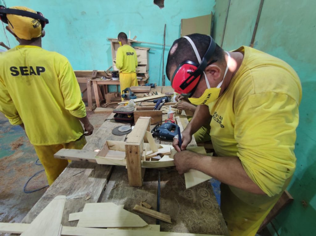 Trabalhando a Liberdade. Foto: Divulgação/SeapA Secretaria de Estado de Administração Penitenciária (SEAP) mobilizou dez internos do Centro de Detenção Provisória de Manaus 2 (CDPM 2), localizado no ramal do km 8 da BR-174 (Manaus-Boa Vista), para a confecção de brinquedos de paletes. Os itens produzidos pela mão de obra carcerária serão doados para as crianças em situação de vulnerabilidade social acolhidas no abrigo Infantil Monte Salém.