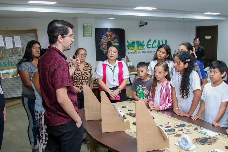 A Prefeitura de Manaus, por meio da Secretaria Municipal de educação (Semed), realizou, nesta quinta-feira, 24/7, a oficina da “Cronologia do Fóssil ao Plástico”, que mobilizou cerca de 20 alunos da escola municipal Hemeterio Cabrinha. A atividade, que iniciou no dia 7/7, segue até a próxima quarta-feira, 30/7, e está sendo realizada no Espaço da Cidadania Ambiental (Ecam), localizado no Manauara Shopping, no bairro Adrianópolis, zona Centro-Sul.A ação é coordenada pela Oca do Conhecimento Ambiental da Semed e tem o objetivo de proporcionar aos estudantes experiências voltadas para as ciências sociais. Durante a atividade, os adolescentes visitaram a exposição “Cronologia Fóssil”, que aborda temas relacionados à ciência e à evolução. Em seguida, participaram de uma aula extraclasse no Buritizal, onde produziram moldes em gesso de trilobitas, além de dentes de Carcharodontosaurus saharicus e Tyrannosaurus rex. A coleção será montada para que cada estudante possa levar uma cópia para a escola e outra para casa.Na ocasião, o coordenador do Ecam, Marzílio Pereira, destacou que, durante o mês de julho, o espaço recebeu um total de três escolas da REDE municipal, o que contribui positivamente para o avanço da educação.“A visita ao Ecam é uma oportunidade de aprendizado para os alunos da Semed. Durante o mês de julho, recebemos três escolas aqui, a primeira participou da abertura da exposição em cartaz, a segunda realizou o Circuito Ambiental, e a terceira participou da Oficina sobre Cronologia Fóssil. Esse espaço é fundamental para proporcionar aos estudantes uma aula fora da sala de aula, promovendo uma experiência interativa que complementa o ensino”, afirmou Marzílio.Para a aluna Bárbara Oliveira, de 10 anos, do 5º ano, participar da atividade foi motivo de alegria e aprendizado. Ela destacou o entusiasmo em conhecer mais sobre os dinossauros e em aprender, na prática, a moldar os dentes desses animais pré-históricos.“Eu achei muito interessante participar dessa exposição. Nunca tinha visto nada parecido de perto, só em filmes e desenhos. Aprender sobre a história deles, como surgiu e como foi o fim da vida desses animais, foi muito proveitoso. Sem contar que também tivemos a oportunidade de fazer moldes dos dentes em gesso”, comentou Bárbara.O professor do projeto, biólogo Flávio Costa, comentou sobre a importância da aula prática para os alunos e como essa experiência PODE ser valiosa para a vida deles.“A exposição é fundamental para promover a divulgação científica e disseminar o conhecimento sobre temas que, antigamente, víamos apenas em livros ou na televisão, algo que parecia distante da nossa realidade. Os materiais que trouxemos, mesmo sendo de espécies extintas, ajudam a entender porque esses animais desapareceram. Isso nos faz refletir sobre a nossa própria existência na Terra, sobre o motivo de estarmos aqui e o que Podemos fazer para evitar seguir o mesmo caminho”, explicou Flávio.