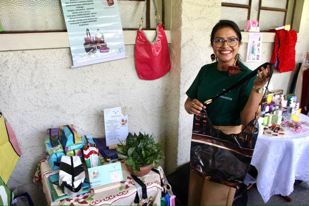 De olho nas questões ambientais, Harlana Souza, 35 anos, proprietária da Mangustos, que transforma lonas de vinil e banners em produtos finais, usa a costura criativa sustentável para confeccionar sacolas de compras, estojos, nécessaire, aventais e bolsas de praia. Há um ano e meio no mercado, a empresa atende pessoas físicas e já tem alguns contratos com empresas.