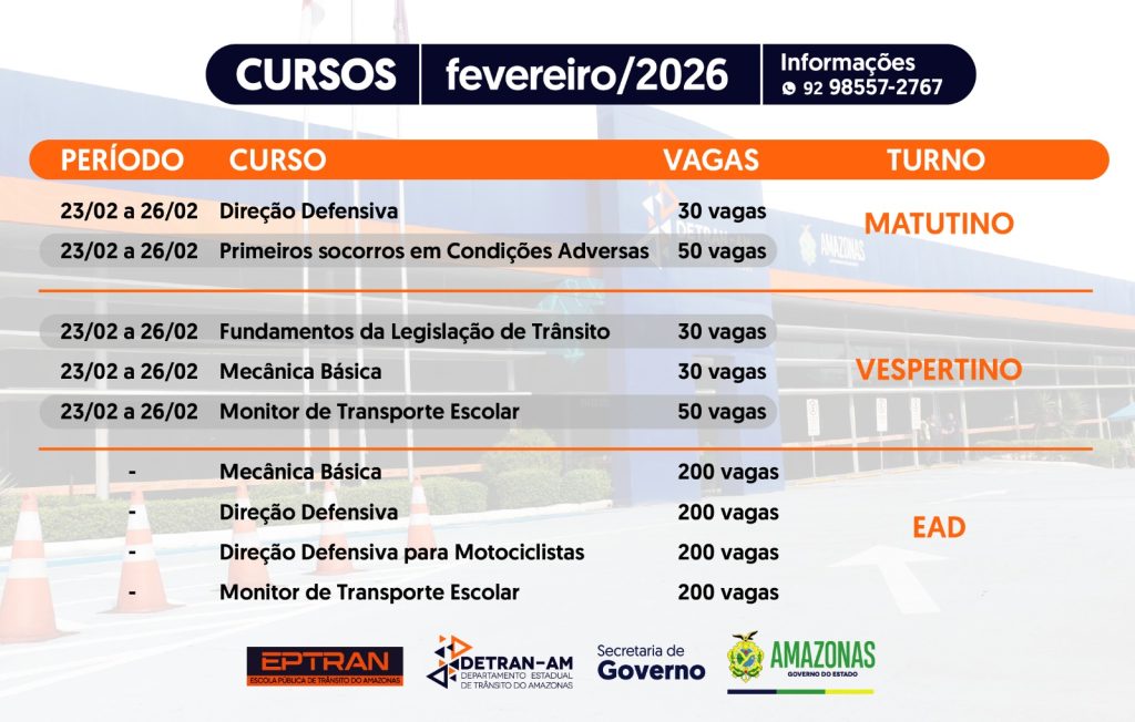 O Detran-AM, por meio da escola pública de Trânsito (Eptran), abriu inscrições para 990 vagas em cursos gratuitos que serão oferecidos ao longo do mês de fevereiro. As turmas presenciais têm aulas a partir do dia 23 de fevereiro e há opções em EaD pelo site eptran.detran.am.gov.br. As inscrições presenciais são feitas na recepção da Eptran, no Shopping Manaus Via Norte, bairro Monte das Oliveiras, zona norte de Manaus, de segunda a sexta-feira, das 9h às 16h.