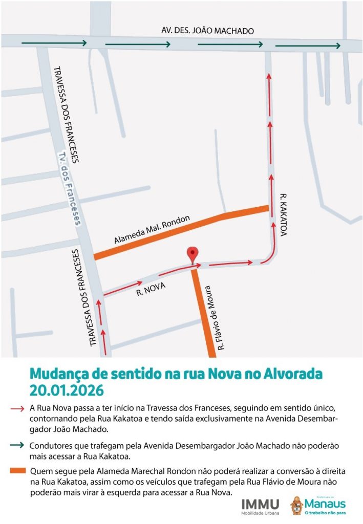 A Prefeitura de Manaus, por meio do Instituto Municipal de mobilidade urbana (IMMU), altera o sentido viário da rua Nova no bairro Alvorada, zona Oeste, a partir de terça-feira, 20/1. A mudança atende a solicitação dos moradores e foi definida após pesquisa com moradores, motoristas e comerciantes, que registrou aprovação de 90%.